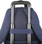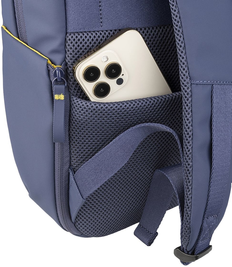 Рюкзак предназначен для 15,6-дюймовых ноутбуков и 16-дюймовых MacBook Pro, изготовлен из переработанной ткани с покрытием для обеспечения водонепроницаемости. Имеет просторное основное отделение, глубокий и вместительный передний карман, защитный задний карман, а также боковые карманы на молнии, идеально подходящие для ношения бутылок или зонтиков. Также есть специальный внутренний карман для трекера (не входит в комплект) и удобный ремень для тележки на спине для легкого крепления к чемодану.