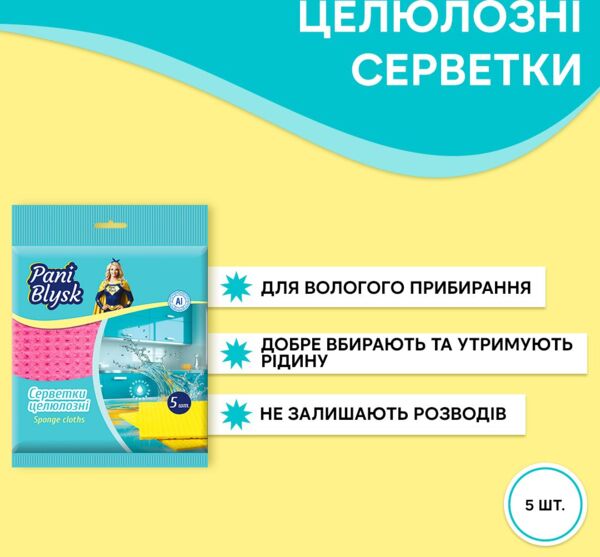 Салфетки влаговпитывающие Pani Blysk изготовлены из целлюлозы, благодаря чему хорошо впитывают влагу и удерживают жидкость. Предназначены для всех видов влажной уборки. Салфетки устойчивы к трению и разрывам, сохраняют свою форму и размеры. Во влажном состоянии салфетка становится мягкой и приятной на ощупь, при высыхании твердеет, благодаря чему обеспечивается препятствие для размножения микробов и неприятных запахов. Pani Blysk - украинская торговая марка Корпорации "Биосфера", разработанная с помощью искусственного интеллекта. Pani Blysk - товары для дома, придающие блеск!