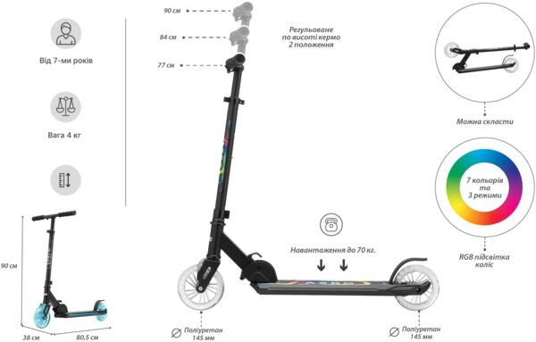 2Е Aero MAX большой RGB самокат! Теперь не нужно выбирать цвет самоката или подсветку колес, 7 разных цветов и 3 типа подсветки в 1 корпусе. Теперь множество вариантов настройки подсветки в одном самокате! Самокат идеально подойдет для ежедневных прогулок, развлечений во дворе или на улице, а благодаря эффектной подсветке - он точно привлечет внимание окружающих. Это отличное решение для родителей, которые ищут безопасный, надежный и визуально привлекательный транспорт для своих детей.