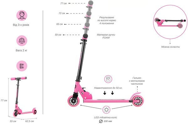 - Для удобства перемещения и хранения конструкция самоката полностью складывается.