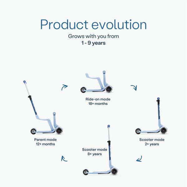 Xtend Mini-ride растет вместе с вашим ребенком от 12 месяцев до 9 лет, плавно превращаясь из каталки в самокат. Благодаря выдвижной подножке и светодиодным колесам, он создан для многих лет активных, веселых приключений.