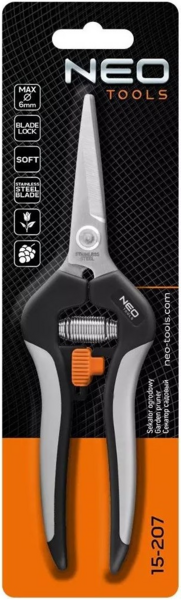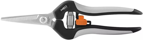Секатор NEO - инструмент, предназначенный для садовых работ. Подходит для работы с небольшими и тонкими растениями, уход за которыми требует определенной точности. Лезвия, оснащенные микронаконечниками, изготовлены из закаленной нержавеющей стали. Эргономичная ручка надежно ложится в руку, а мягкие элементы на ручке повышают комфорт использования. Секатор имеет предохранительный механизм, который позволяет заблокировать инструмент с помощью одной кнопки.