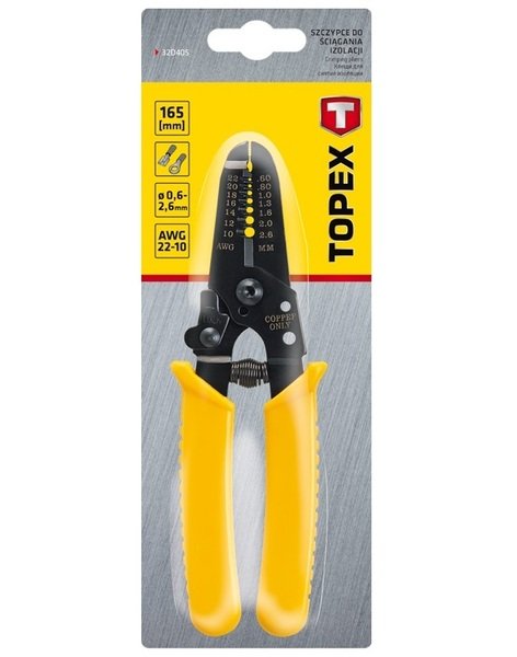 Клещи для зачистки проводов TOPEX длиной 165 мм, для проводов диаметром от 0.6 до 2.6 мм². Предназначены для обжима изоляции. Рукоятки, покрытые антискользящей пластмассой, обеспечивают комфорт во время работы. Бренд TOPEX предназначен для домашних мастеров.