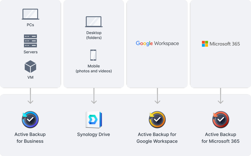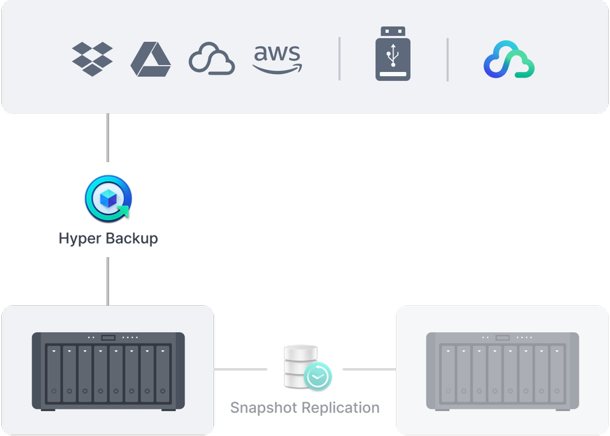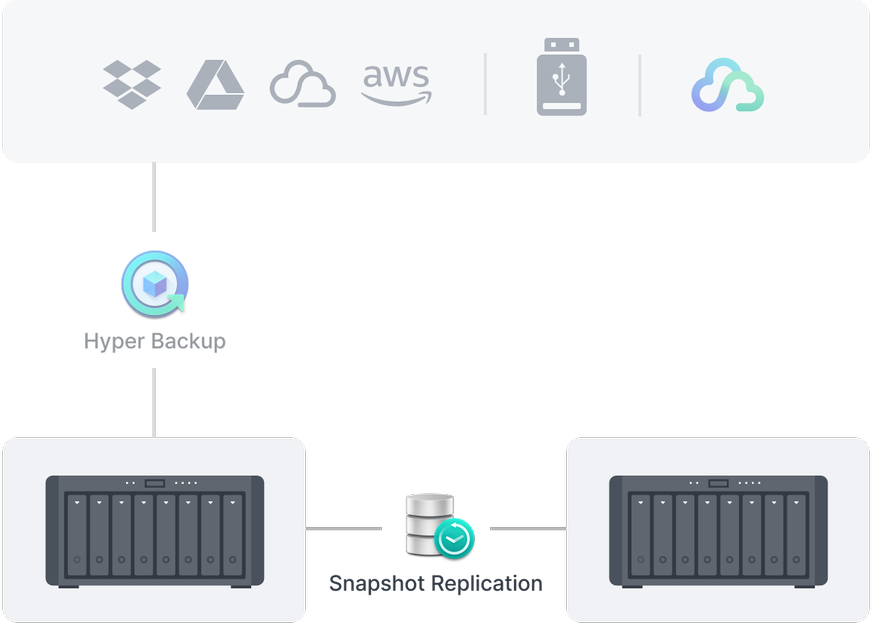 Защитите все данные, приложения и конфигурации в системах Synology с помощью комплексного запланированного резервного копирования, включая резервное копирование платформы без ОС, на локальные и удаленные серверы, внешние диски или в облачные хранилища, включая хранилище Synology C2 Storage.