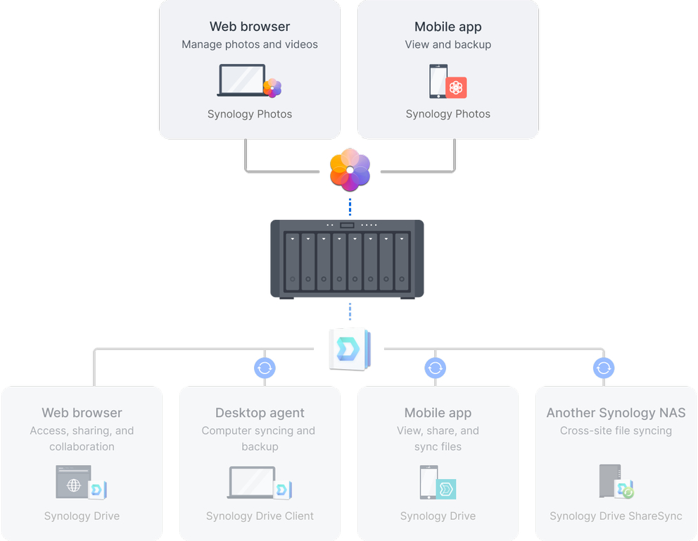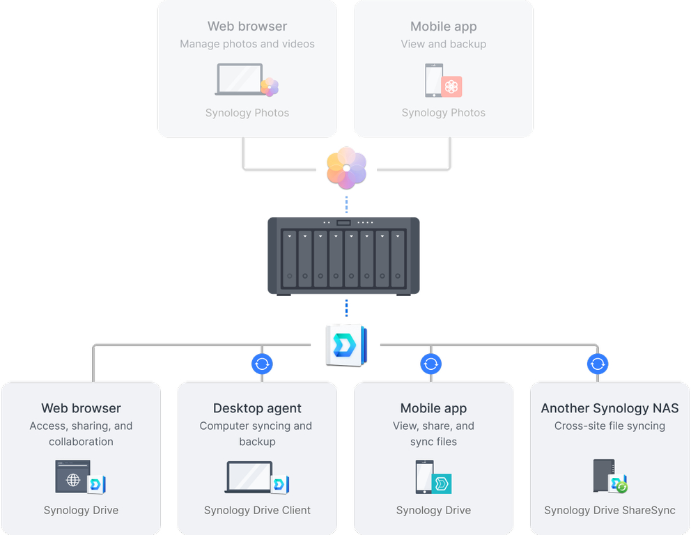 Автоматическая синхронизация данных между Synology NAS и крупнейшими облачными сервисами, включая BackBlaze B2, Dropbox, Google Диск и Microsoft OneDrive. Поддержка различных протоколов, шифрование на стороне клиента, а также настраиваемые элементы управления синхронизацией и полосой пропускания обеспечивают эффективное управление хранением данных на различных платформах.