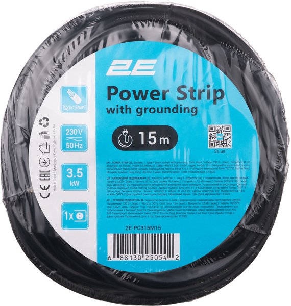 - Сетевой удлинитель 2E 1XSchuko, 3G*1.5мм, 15м, Black (2E-PC315M15)