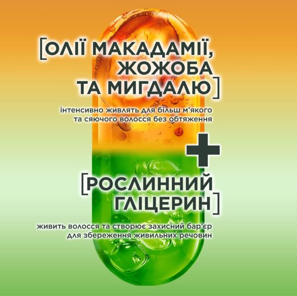 - Комплекс миндаля, жожоба и макадамии насыщает волосы полезными веществами и витаминами, возвращая эластичность и естественную мягкость.