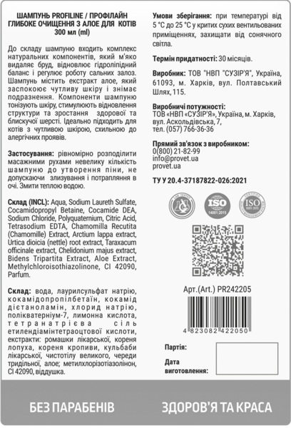 В состав шампуня входит комплекс натуральных компонентов, который мягко удаляет грязь, восстанавливает гидролипидный баланс и регулирует работу сальных желез. Шампунь содержит экстракт алоэ, который успокаивает чувствительную кожу и снимает раздражение. Компоненты шампуня тонизируют кожу, стимулируют восстановление структуры и рост здоровой, блестящей шерсти. Идеально подходит для котов с чувствительной кожей, склонной к аллергическим проявлениям.