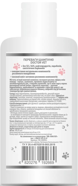 Шампунь Doctor Vet - это специализированное средство по уходу за шерстью и кожей собак, предназначенное для регулярного мытья и поддержания чистоты вашего домашнего любимца. Содержит мягкий моющий комплекс, вытяжки растений, эфирное масло лимона - тонизирует, успокаивает, проявляет анальгезирующее и антибактериальное действие, стимулирует кровообращение, что способствует регенерации клеток кожи. Способен восстанавливать, уплотнять и выравнивать структуру шерсти, что обеспечивает сохранность водного баланса, предохраняет от воздействия высоких температур при сушке феном. Это важное средство для поддержки гигиены, здоровья и приятного вида вашего домашнего питомца. Выбор соответствующего шампуня и регулярный уход помогут вашей собаке чувствовать себя комфортно и иметь красивый вид шерсти.