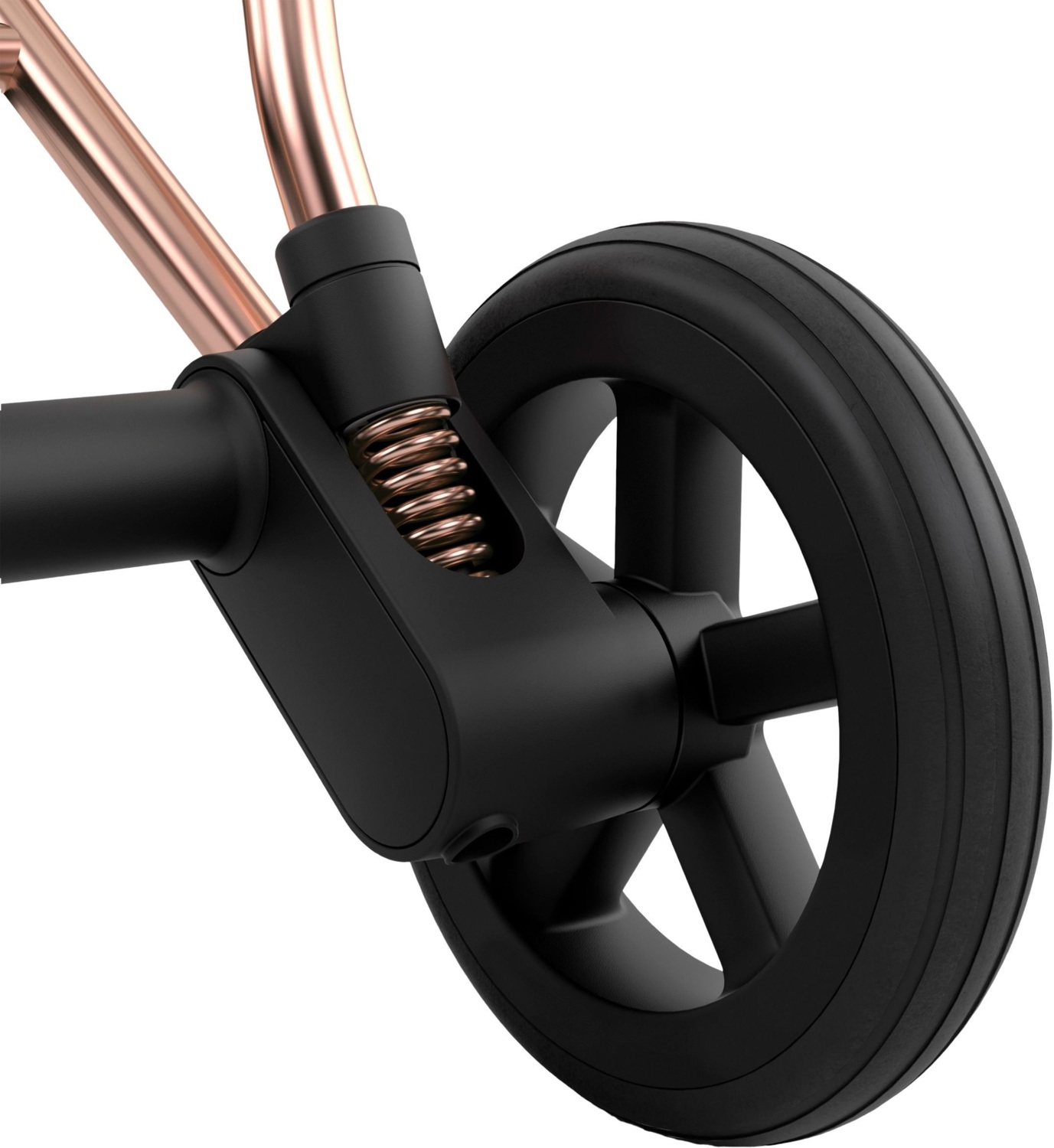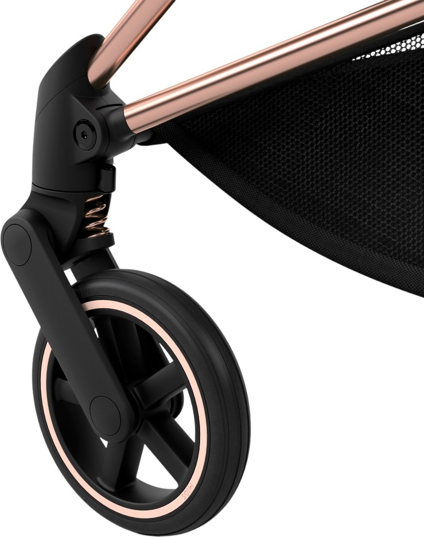 Ход коляски остается мягким и плавным независимо от качества дорожного покрытия. Колеса одинакового диаметра оснащены современными амортизаторами и подшипниками, которые эффективно поглощают удары. Передние колеса гарантируют исключительную маневренность, а для стабильного движения по неровным поверхностям их можно мгновенно заблокировать с помощью удобного рычага на раме.