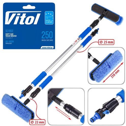 Щетка для мытья автомобилей от Vitol - лучший помощник для ухода за Вашим автомобилем. В конструкции щетки предусмотрена длинная телескопическая ручка, которая растягивается до 168 см, делая мытье авто максимально удобным и эффективным.