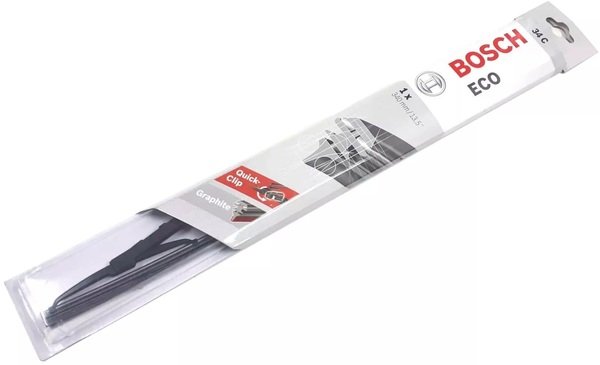 Автомобильные дворники серии Bosch Eco были выпущены легендарной компанией, как бюджетная линейка. Главное их преимущество заключается в невысокой цене и достойном качестве. Каркас дворника выполнен из металла высокого качества. Для защиты от коррозии, все металлические части стеклоочистителя покрыты двойным слоем порошковой краски. Особое внимание следует уделить резинке стеклоочистителя. Она сделана методом литья, из натурального каучука. Благодаря такому способу изготовления, лезвие получает идеальную рабочую кромку, на которой отсутствуют заусенцы и неровности. Резинка не вступает в реакцию с агрессивными компонентами омывателя лобового стекла, не пересыхает под воздействием солнечных лучей и высоких температур окружающей среды. Не трескается и не становится хрупкой на морозе. Для тихого и плавного скольжения дворника по стеклу, на лезвие нанесен тонкий слой графитового напыления, которое также защищает ее от агрессивного воздействия окружающей среды. Еще одной особенностью Bosch Eco является возможность замены резинки отдельно от всего механизма коромысел. Еще одной особенностью Bosch Eco является возможность замены резинки отдельно от всего механизма коромысел.
