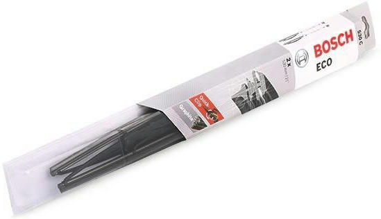 Автомобильные дворники серии Bosch Eco были выпущены легендарной компанией, как бюджетная линейка. Главное их преимущество заключается в невысокой цене и достойном качестве. Каркас дворника выполнен из металла высокого качества. Для защиты от коррозии, все металлические части стеклоочистителя покрыты двойным слоем порошковой краски. Особое внимание следует уделить резинке стеклоочистителя. Она сделана методом литья, из натурального каучука. Благодаря такому способу изготовления, лезвие получает идеальную рабочую кромку, на которой отсутствуют заусенцы и неровности. Резинка не вступает в реакцию с агрессивными компонентами омывателя лобового стекла, не пересыхает под воздействием солнечных лучей и высоких температур окружающей среды. Не трескается и не становится хрупкой на морозе. Для тихого и плавного скольжения дворника по стеклу, на лезвие нанесен тонкий слой графитового напыления, которое также защищает ее от агрессивного воздействия окружающей среды. Еще одной особенностью Bosch Eco является возможность замены резинки отдельно от всего механизма коромысел. Совместим с автомобилями Audi, Chevrolet, Chrysler, Jaguar, Jeep, Nissan, Saab, Smart, Toyota, Volkswagen, Volvo, Lada, УАЗ.