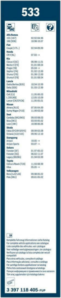 В основе дворников Bosch Twin лежит прочный цельнометаллический каркас с системой зажимов, который максимально устойчив при любых погодных условиях благодаря двойной защите от коррозии. Отлично зарекомендовавшая себя технология Twin (использование двухкомпонентной синтетической резины) позволяет обеспечить эффективную очистку стекла и долговечность самих дворников. Совместим с автомобилями Alfa Romeo, Fiat, Honda, Kia, Lancia, Mitsubishi, Nissan, Seat, Skoda, SsangYong, Subaru, Toyota, Volkswagen.