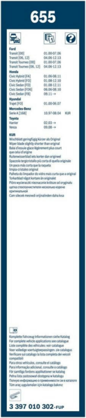 В основе дворников Bosch Twin лежит прочный цельнометаллический каркас с системой зажимов, который максимально устойчив при любых погодных условиях благодаря двойной защите от коррозии. Отлично зарекомендовавшая себя технология Twin (использование двухкомпонентной синтетической резины) позволяет обеспечить эффективную очистку стекла и долговечность самих дворников. Совместим с автомобилями Ford, Honda, Hyundai, Mercedes, Toyota.
