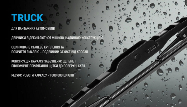 Каркасная конструкция щеток Voin Truck обеспечивает максимальное прилегание к стеклу во время работы. Металл каркаса покрыт цинком и высококачественной краской для защиты от коррозии, имеет усиленный каркас и долговечный ресурс (1 500 000 движений). Стеклоочистители Voin Truck обеспечивают бесшумную работу благодаря нанографитовому покрытию резинки из натурального каучука, что гарантирует их длительное использование (500 000 движений).