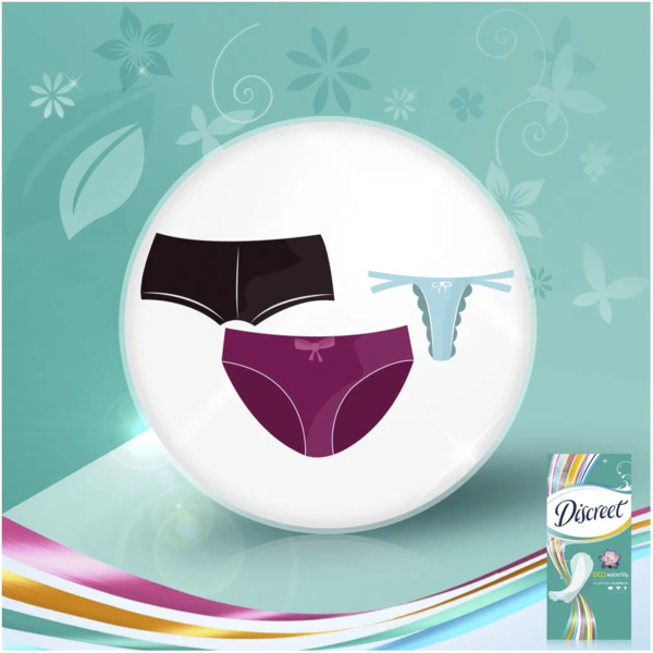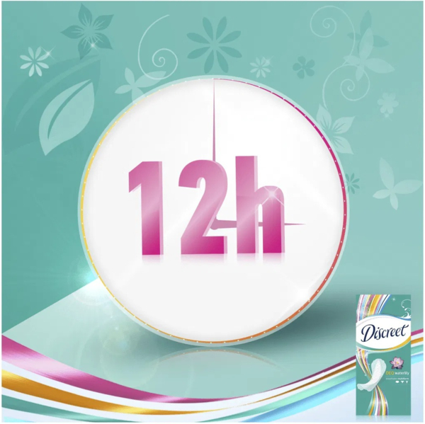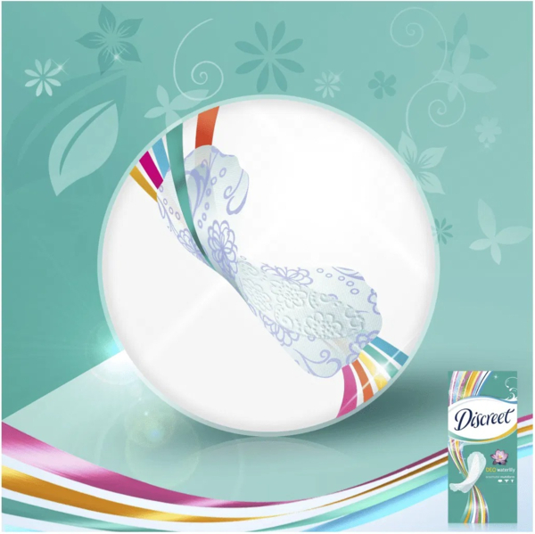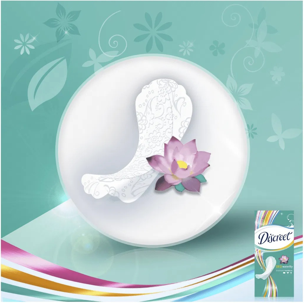 Ежедневные гигиенические прокладки Discreet Waterlilly не только дарят ощущение свежести, но и помогают всем девушкам чувствовать себя красивыми! Эти ежедневные гигиенические прокладки позволяют коже дышать, обеспечивая свежесть и комфорт до 12 часов. Они настолько тонкие, что вы их даже не почувствуете, и, кроме того, их особая форма подойдет для любого белья. Фирменный аромат водяной лилии дарит ощущение свежести и женственности. С этими прокладками вы будете чувствовать свежесть в течение всего дня, в любой ситуации!