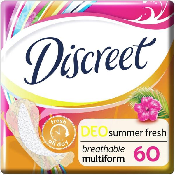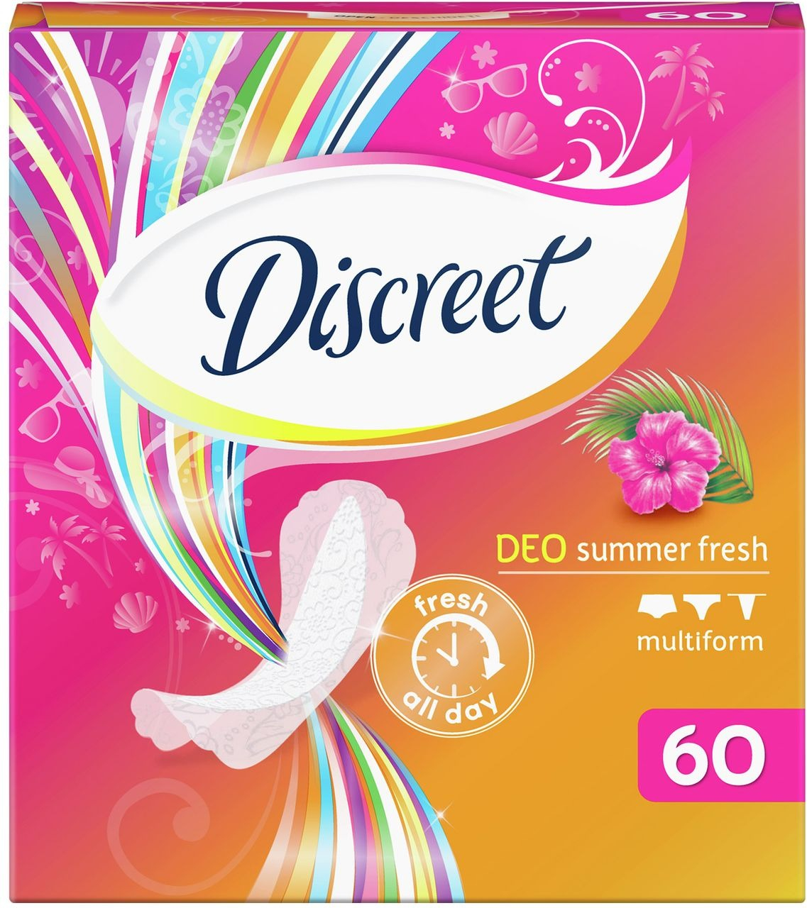 Нежный аромат ежедневных гигиенических прокладок Discreet Summer Fresh подарит вам приятное ощущение свежести и поможет чувствовать себя красивой! Эти ежедневные прокладки позволяют коже дышать, обеспечивая свежесть и комфорт на 12 часов. Они настолько тонкие, что вы их даже не почувствуете, и кроме того, их особая форма подойдет для любого белья. Повторяют движения вашего тела в течение всего дня.