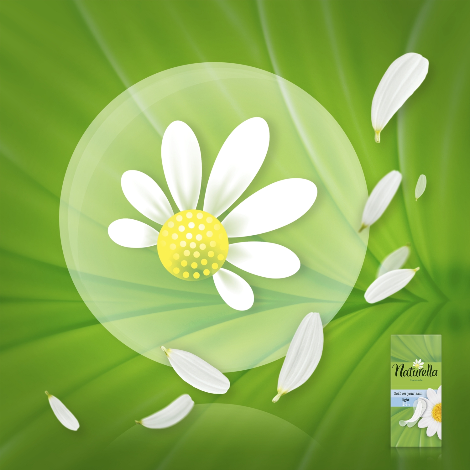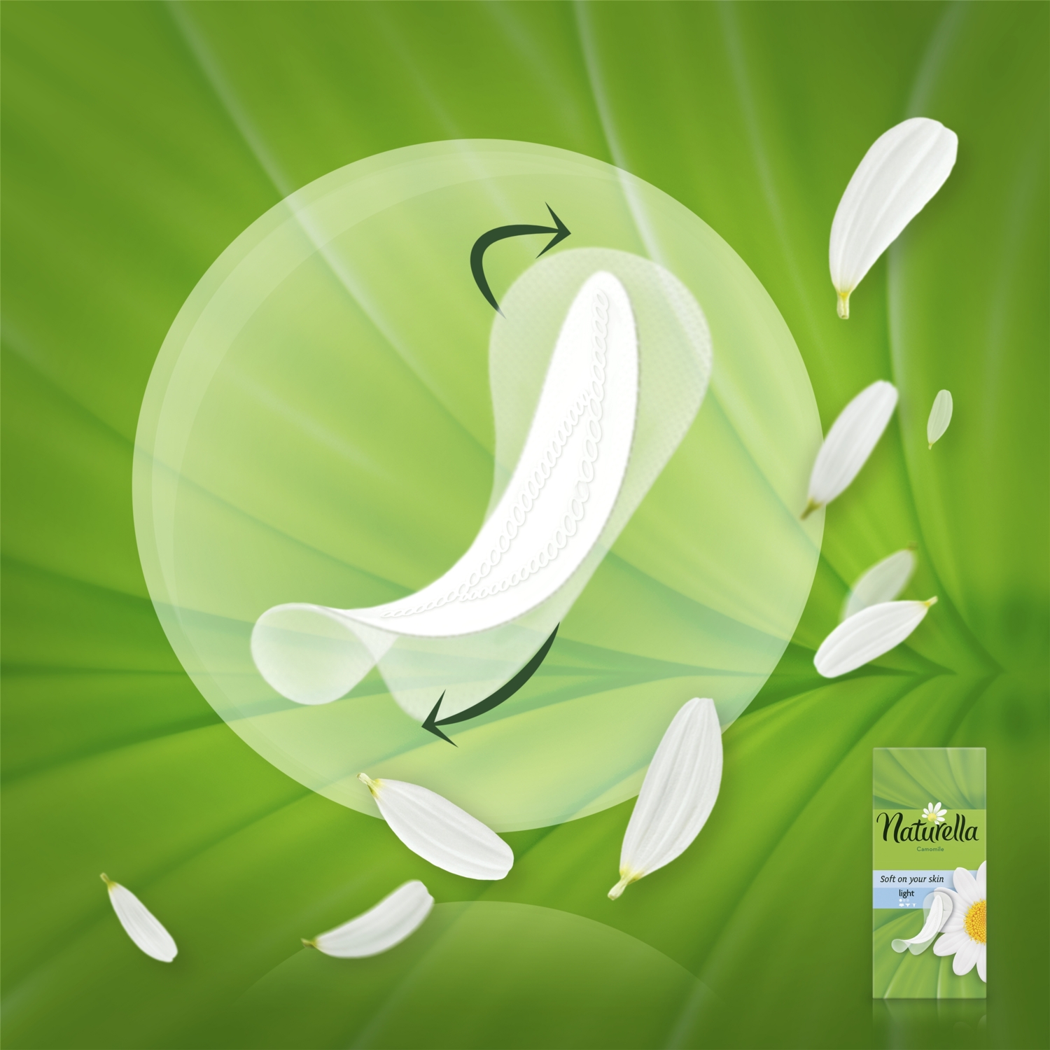 Ежедневные прокладки Naturella Light — мягкие, как лепестки ромашки. С прокладками Naturella Light ощущение свежести не покинет вас ни на мгновение в течение всего дня. Они очень тонкие и нежно пахнут ромашкой, прекрасно подойдут для ежедневных выделений или помогут в первые и последние дни месячных. Что делает гигиенические прокладки Naturella уникальными — это верхний слой. На ощупь он похож на хлопок и обогащен полосками с кремом-бальзамом, содержащим ромашку, который помогает ухаживать за кожей. Ежедневные гигиенические прокладки Naturella Light одобрены дерматологами.
