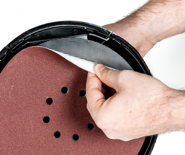 Шлифовальный диск оснащен крючком и петлей, что позволяет легко менять наждачную бумагу.