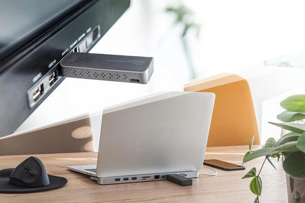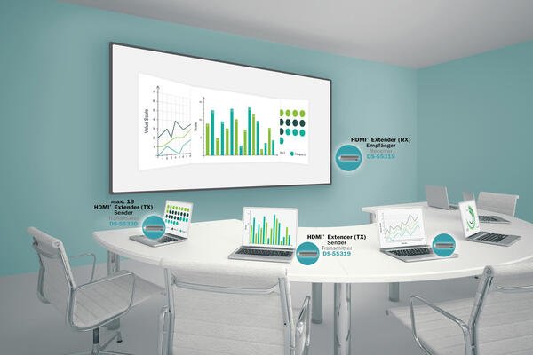 С помощью беспроводной презентационной системы вы можете без проводов передавать видео- и аудиосигналы HDMI на расстояние до 50 м в свободном доступе. Эксплуатация и установка - это детская игра. Настоящий Plug & Play - подключи и начинай. С помощью дополнительных передатчиков (DS-55320) комплект можно расширить до 16 передатчиков (всего). Быстро и легко переключайтесь на нужную станцию одним нажатием кнопки для воспроизведения вашего контента. Вы также можете делиться контентом со своего мобильного устройства (смартфона/планшета) непосредственно через соответствующую операционную систему вашего устройства, без приложения. Передатчик и приемник можно запитать через HDMI-разъем вашего устройства (необходим ток 0,5 А), или (дополнительно) с помощью прилагаемого кабеля micro USB через USB-разъем вашего ноутбука, ПК и т.д. Благодаря компактному дизайну передатчик и приемник легко и быстро устанавливаются индивидуально — идеальное решение для переговорных, конференц-залов или конгресс-комнат.