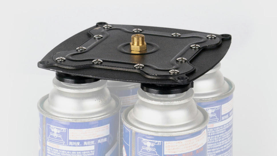 Конструкция BRS-Q5A представляет собой металлическую пластину с четырьмя соединениями, в каждое из которых вставляется газовый картридж. Это действие выполняется в один простой шаг: кассетный баллон вставляется в соединение и поворачивается по часовой стрелке до полной фиксации. Далее нужно присоединить газовый шланг к центровому резьбовому соединению, после чего горелка готова к использованию. Для отсоединения газгольдера нужно выполнить те же действия в обратном порядке.
