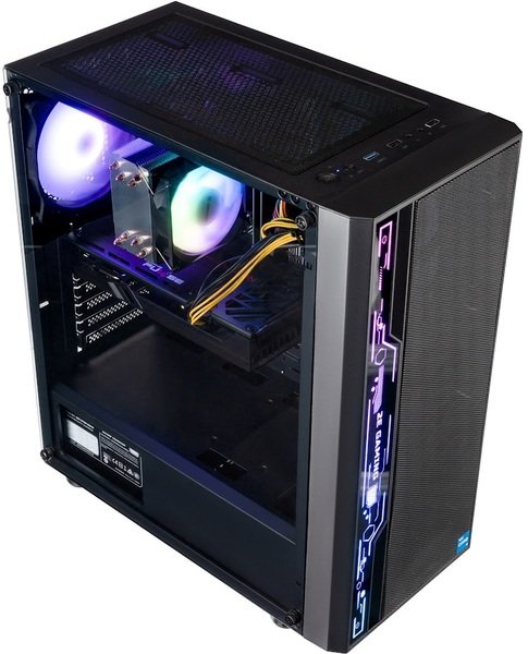 Среди примечательных особенностей системного блока - вентиляторы с RGB подсветкой, а также боковая панель из закаленного стекла.