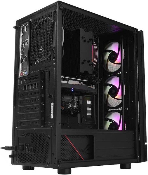 Среди примечательных особенностей системного блока - вентиляторы с RGB подсветкой, а также боковая панель из закаленного стекла.