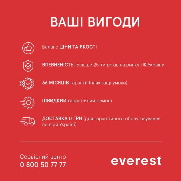 Компания Everest - более 27 лет является ведущим производителем персональных компьютеров в Украине. Все компьютеры проходят тщательное предпродажное тестирование. Мы предоставляем лучший в Украине сервисный пакет - 36 месяцев гарантии, бесплатную доставку по всей Украине при гарантийном обращении и ремонт в максимально короткие сроки.