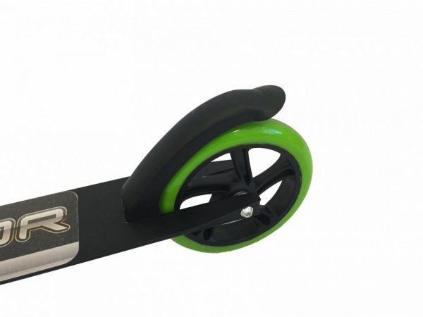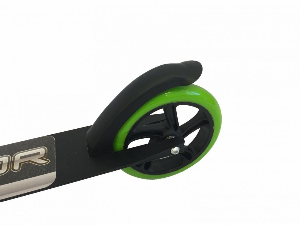 Скутер имеет прочную алюминиевую раму, регулируемый руль, удобные грипсы, задний тормоз, специальное покрытие площадки для ног, что исключает скольжение подошвы во время поездки и полиуретановые колеса, которые обеспечивают устойчивость и безопасность.