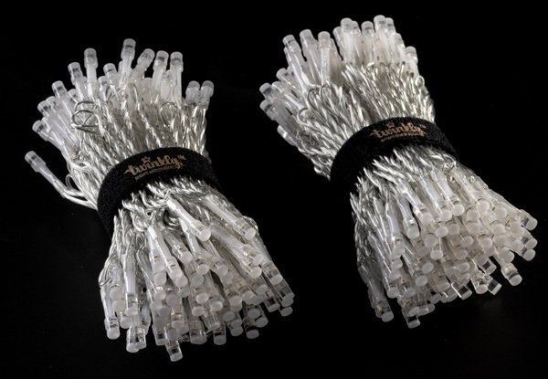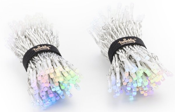 Серия Strings - одна из семейства разных типов гирлянд Twinkly, в ней LED лампочки расположены как на традиционных гирляндах, одна за одной, на расстоянии 8cм по длинной нити (strings). Наилучшим образом гирлянда Strings показывает себя при плотном обматывании объемных объектов или заполнении плоскостей, объемов, хотя годится и для акцентирования линий. Ее часто просто укладывают на снегу или траве хаотичным узором.