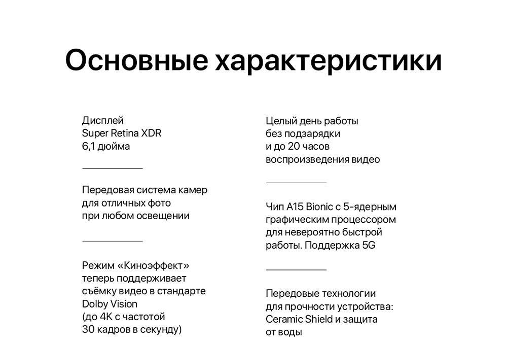 | Комплектация (возможны изменения в разных поставках) | Документация, Инструмент для извлечения Sim-карты, Кабель USB‑C/Lightning, Смартфон |