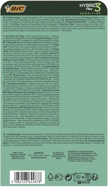 BIC — всемирно известный бренд, который производит канцелярскую продукцию, одноразовые бритье станки, зажигалки и другие безделушки. Производство бритв фирмой BIC начинается 1975 года. Бритва BIC Flex Hybrid разработана специально для ультрамягкого бритья. В упаковке 4 сменные кассеты. Особенности: 3 нанотехнологические лезвия для экстра чистого бритья и легкого промывания. Увлажняющая полоска с Алоэ Вера и витамином Е.