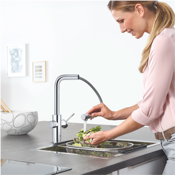 Получайте чистую столовую воду у вас на кухне. В стартовый комплект Grohe входят смеситель и набор для фильтрации воды. Отдельные внутренние водные пути для фильтрованной и нефильтрованной воды.