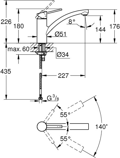Излив смесителя имеет угол поворота 140 градусов - отличное решение для небольших кухонь с малым количеством свободного пространства. Управление осуществляется с помощью надежной ручки, а внутри смесителя спрятан керамический картридж Grohe SilkMove, который предлагает точное и плавное управление температурой и напором воды.