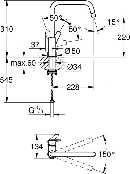| Особенности | Аэратор, Ограничитель температуры воды, Угол поворота излива 150° |