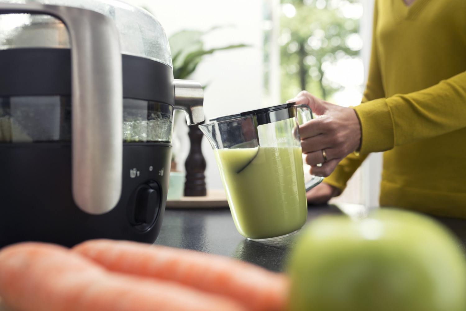 Выжимайте без усилий соки из самых твердых фруктов и овощей с помощью мощного двигателя 1000 Вт.