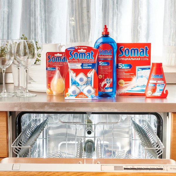- Добавьте соль Somat (учитывая рекомендации производителя) в специальное отделение посудомоечной машины