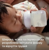 Широкая, мягкая и гибкая соска создана так, чтобы имитировать форму груди и ощущения от нее, помогая ребенку удобно сосать соску и есть.