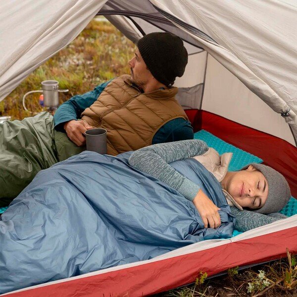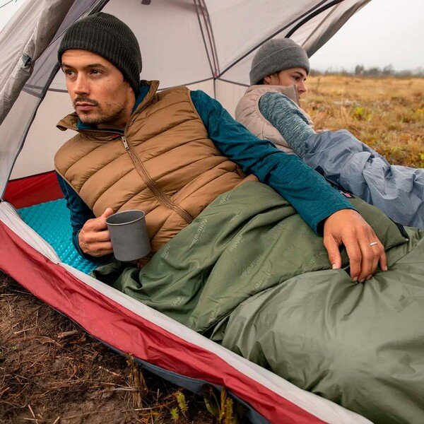 Спальный мешок можно соединить с еще одним одноместным спальником, чтобы получился двухместный, предоставляя телу больше свободного пространства.