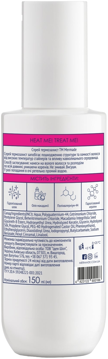 Спрей-термозащита для волос Mermade создает тонкую защитную пленку вокруг каждого волоса, что помогает уберечь их от негативного воздействия высоких температур и уменьшает вероятность повреждений. Волосы, защищенные спреем для термозащиты, становятся более послушными, легче поддаются стайлингу, уменьшается негативное воздействие высоких температур на волосы при регулярном использовании.