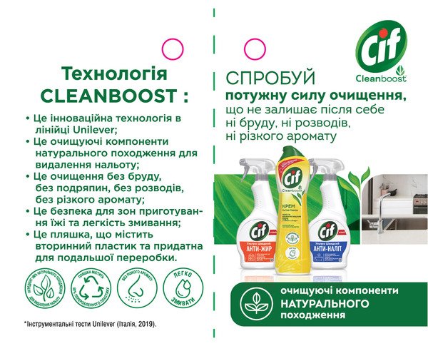 Вы только что закончили уборку в ванной, но следы от капель воды, известковый налет и мыльные отложения тут же возвращаются и лишают поверхности блеска? Инновация в спреях Cif — технология водо- и грязеотталкивания. Уникальная технология" создает защитное покрытие на поверхностях, которые соприкасаются с водой. В результате поверхности отталкивают воду и грязь, продлевая эффект чистоты и блеска без Ваших дополнительных усилий.