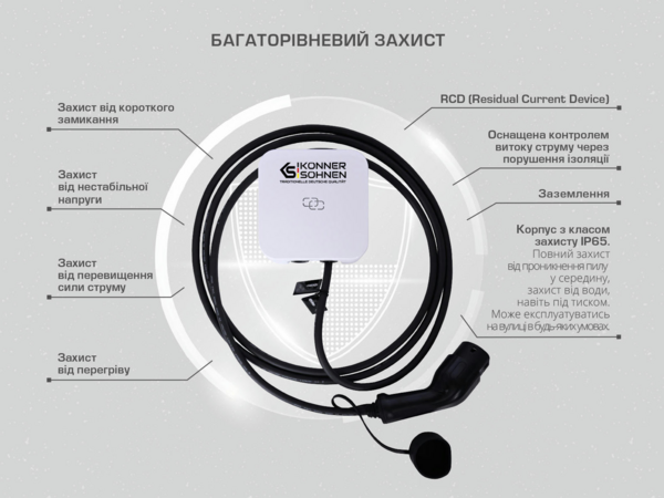 Станции для зарядки электромобилей серии KS P от Könner & Söhnen изготовлены в корпусе с классом защиты IP65, что обеспечивает полную защиту от проникновения пыли внутрь, и защиту от струй воды падающих под любым углом даже под давлением. Это устройство может эксплуатироваться на улице в любых условиях.