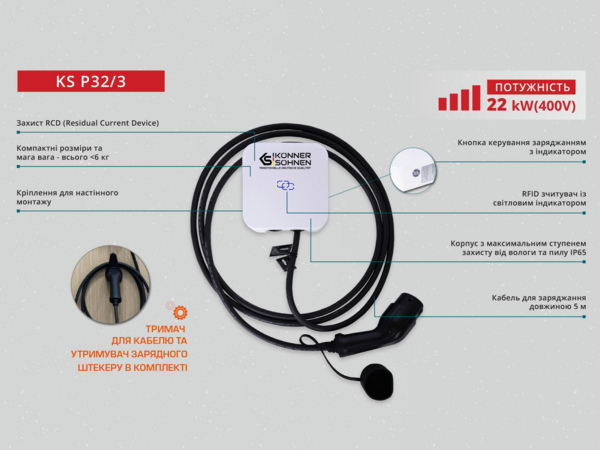 Станция для зарядки электромобилей KS P32/3 - это удобный и надежный способ зарядки электромобиля. Зарядка проходит быстрее и безопаснее. Зарядная станция имеет встроенную защиту от перегрузки, а также от утечки тока при нарушении изоляции и прямом прикосновении к одной из токоведущих частей.