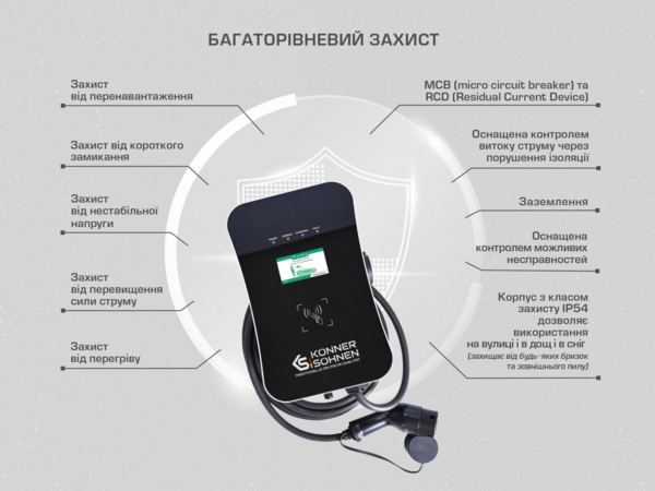 Станция предназначена для быстрой зарядки электромобилей, имеет многоуровневую защиту от перегрева, нестабильного напряжения, превышения силы тока, перегрузки, короткого замыкания, неблагоприятных погодных условий и внешней пыли. Оснащена МСВ (micro circuit breaker) - автоматическим выключателем, заземлением, контролем утечки тока из-за нарушения изоляции, контролем возможных неисправностей, классом защиты IP54. Благодаря станции возможна зарядка батареи электромобиля большей мощностью чем через контроллеры зарядки, которые подключаются в обычную розетку.