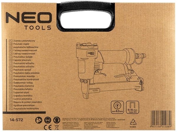 Степлер Neo Tools пневматический 6-16мм, скобы тип 80 (14-572)