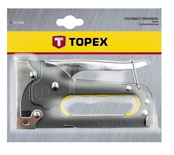 Весьма удобен степлер Топекс 41e903. К тому же он еще и прочный, выдерживает множественные падения и никакие повреждения ему не наносятся. Без особо труда пробивает мягкие материалы. В дерево входит неплохо, при чем скобы не деформируются, даже добивать молотком не приходится. Чтоб не испортить материал можно регулировать силу удара - все делается просто, мощность регулируется винтом.