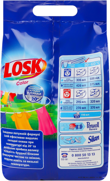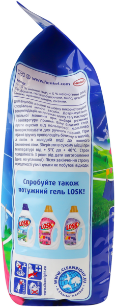 Благодаря мощной формуле Losk эффективно удаляет сложные пятна при температуре от 20° и позволяет сделать большое количество грязного белья блестяще чистым и свежим, стирая даже при низкой температуре. Стиральное средство Losk для цветных вещей предназначено для стирки изделий из хлопка и льна, синтетических тканей и тканей из смешанных волокон (кроме шерсти и шелка) в стиральных машинах автоматического типа и ручной стирки в воде любой жесткости. Стиральный порошок Losk не содержит фосфатов, поэтому является безопасным как во время стирки, так и во время эксплуатации вещей.