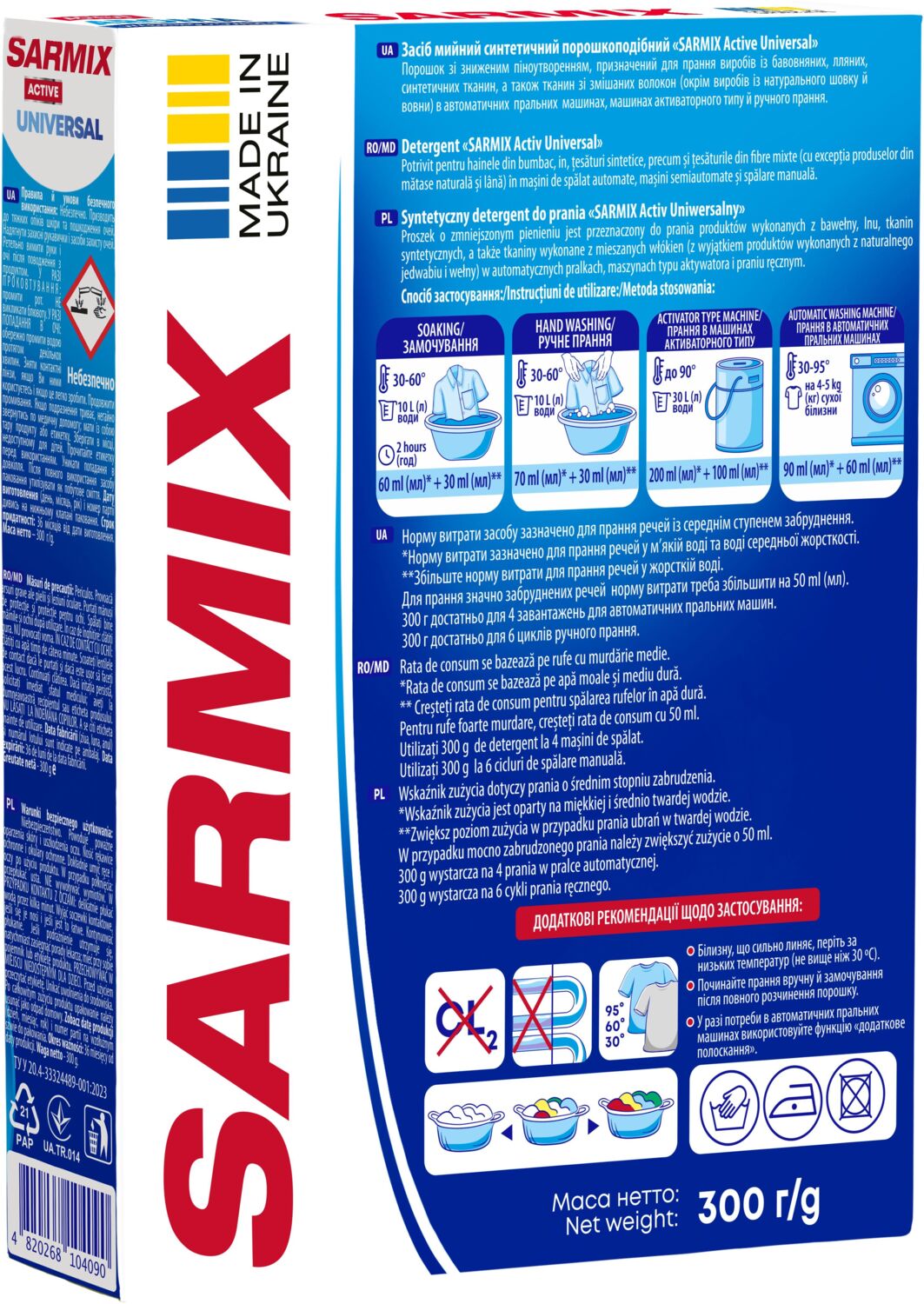 Стиральный порошок Sarmix Active Universal предназначен для стирки изделий из хлопчатобумажных, льняных, синтетических тканей, а также тканей из смешанных волокон (кроме изделий из натурального шелка и шерсти).
