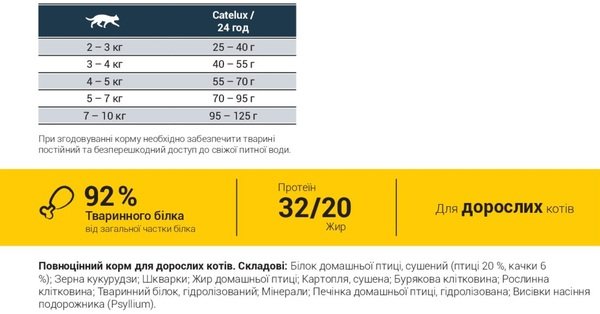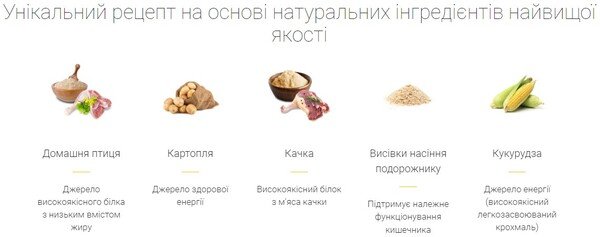 | Состав | Белок домашней птицы, сушеный (птицы 20%, утки 6%); Зерна кукурузы; Шкварки; Жир домашней птицы; Картофель, сушеный; Свекольная клетчатка; Растительная клетчатка; Животный белок, гидролизованный; Минералы; Печень домашней птицы, гидролизованная; Отруби семян подорожника (Psyllium) |